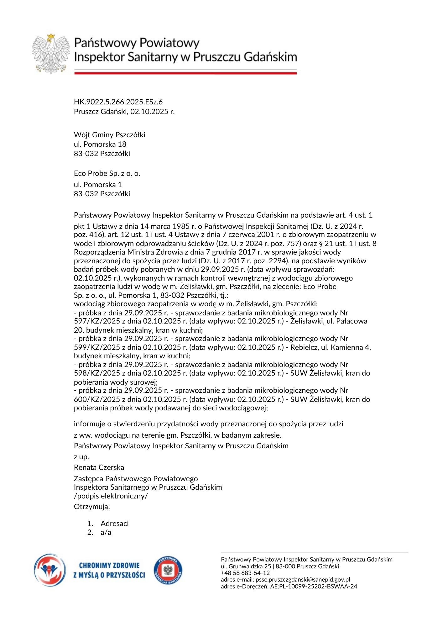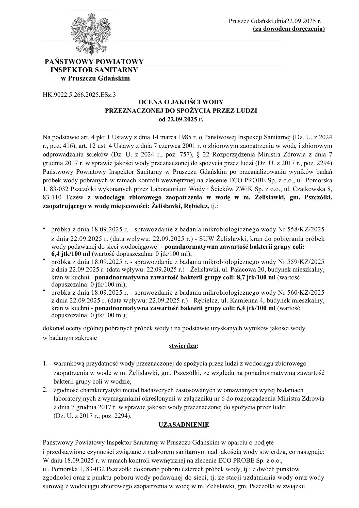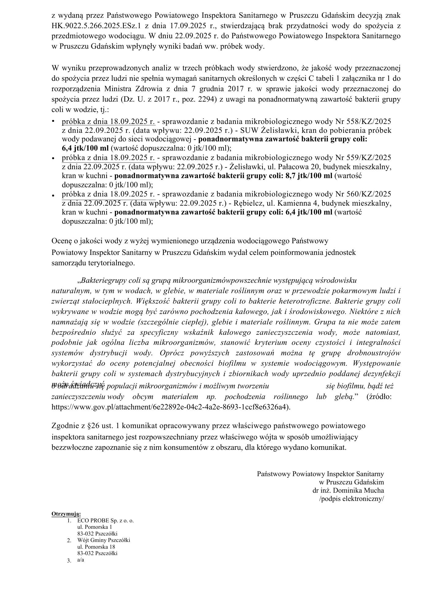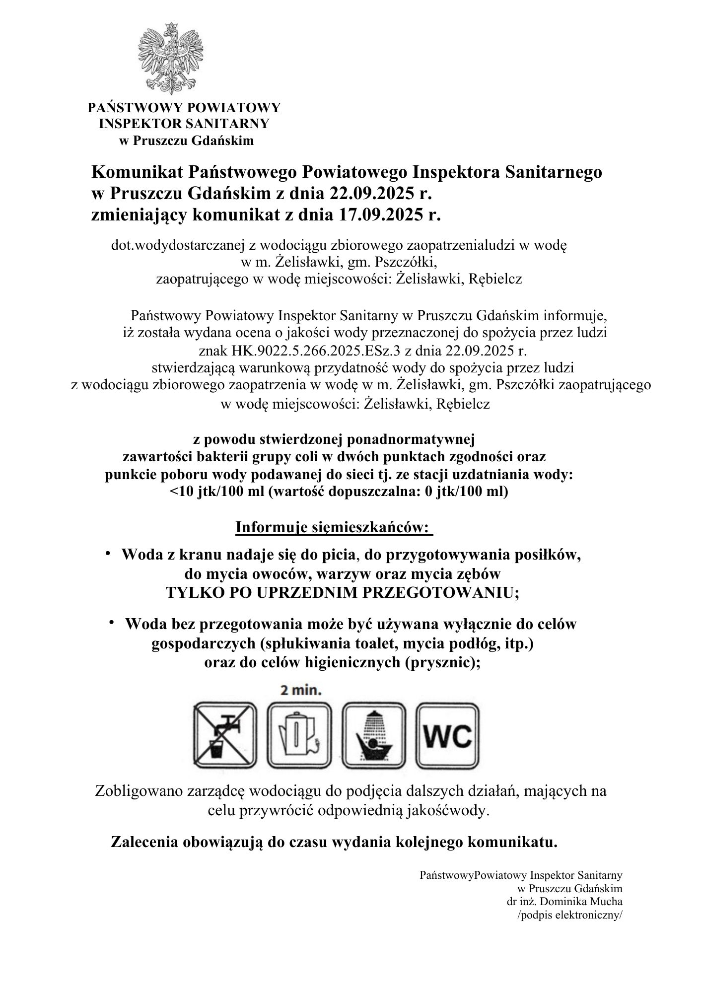 zgodnie z najnowszym komunikatem sanepidu z dn. 22.09.2025r. woda z kranu nadaje się do picia, przygotowywania posiłków, mycia owoców, warzyw oraz mycia zębów TYLKO PO UPRZEDNIM PRZEGOTOWANIU;