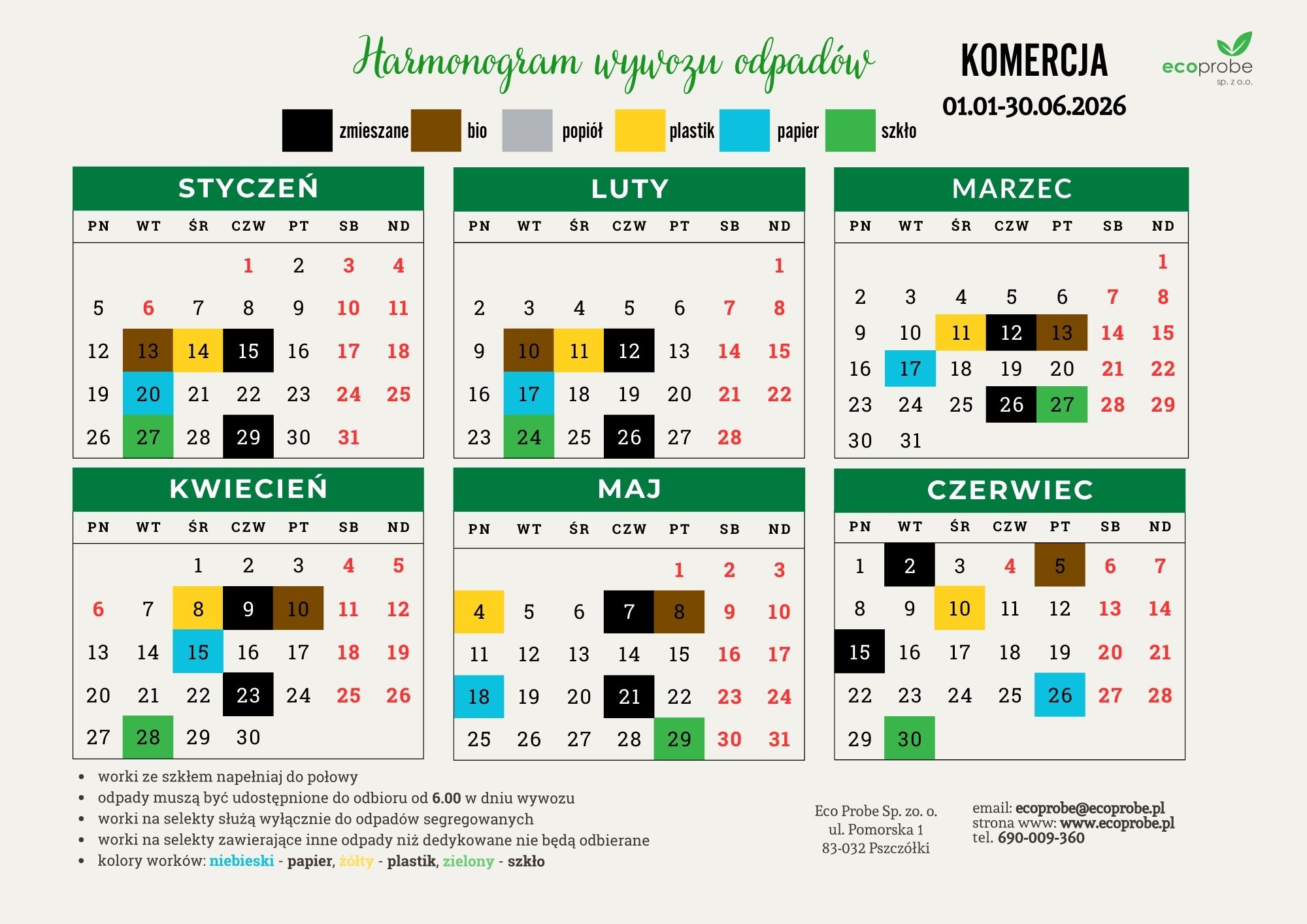 HARMONOGRAM ODBIORU ODPADÓW DLA FIRM 01.01.2026-30.06.2026