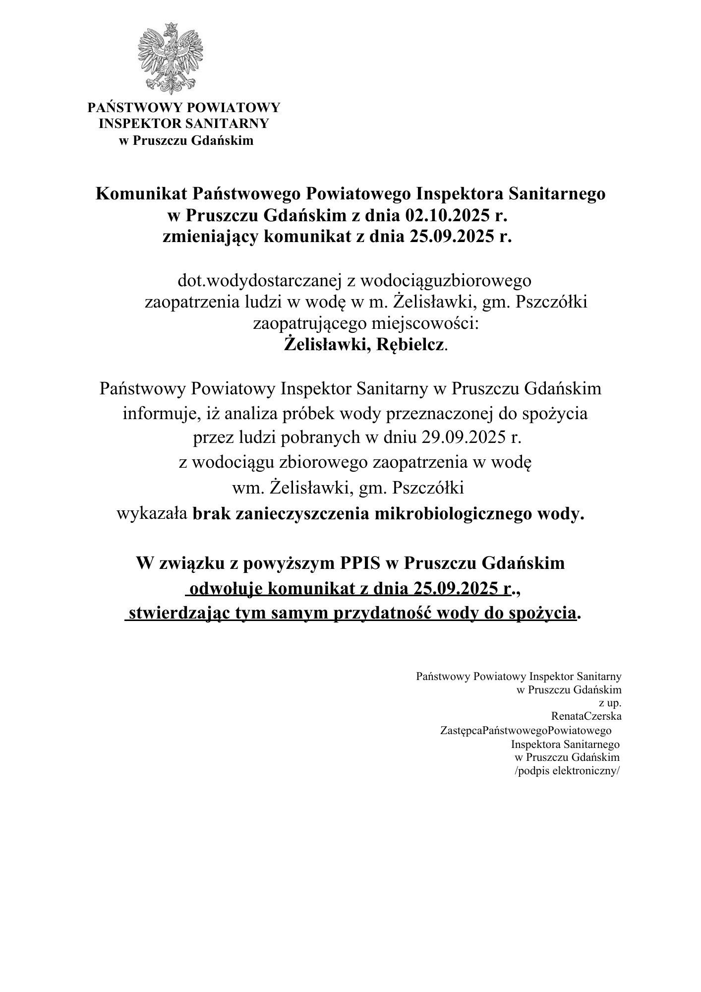 zgodnie z najnowszym komunikatem sanepidu z dn. 22.09.2025r. woda z kranu nadaje się do picia, przygotowywania posiłków, mycia owoców, warzyw oraz mycia zębów TYLKO PO UPRZEDNIM PRZEGOTOWANIU;
