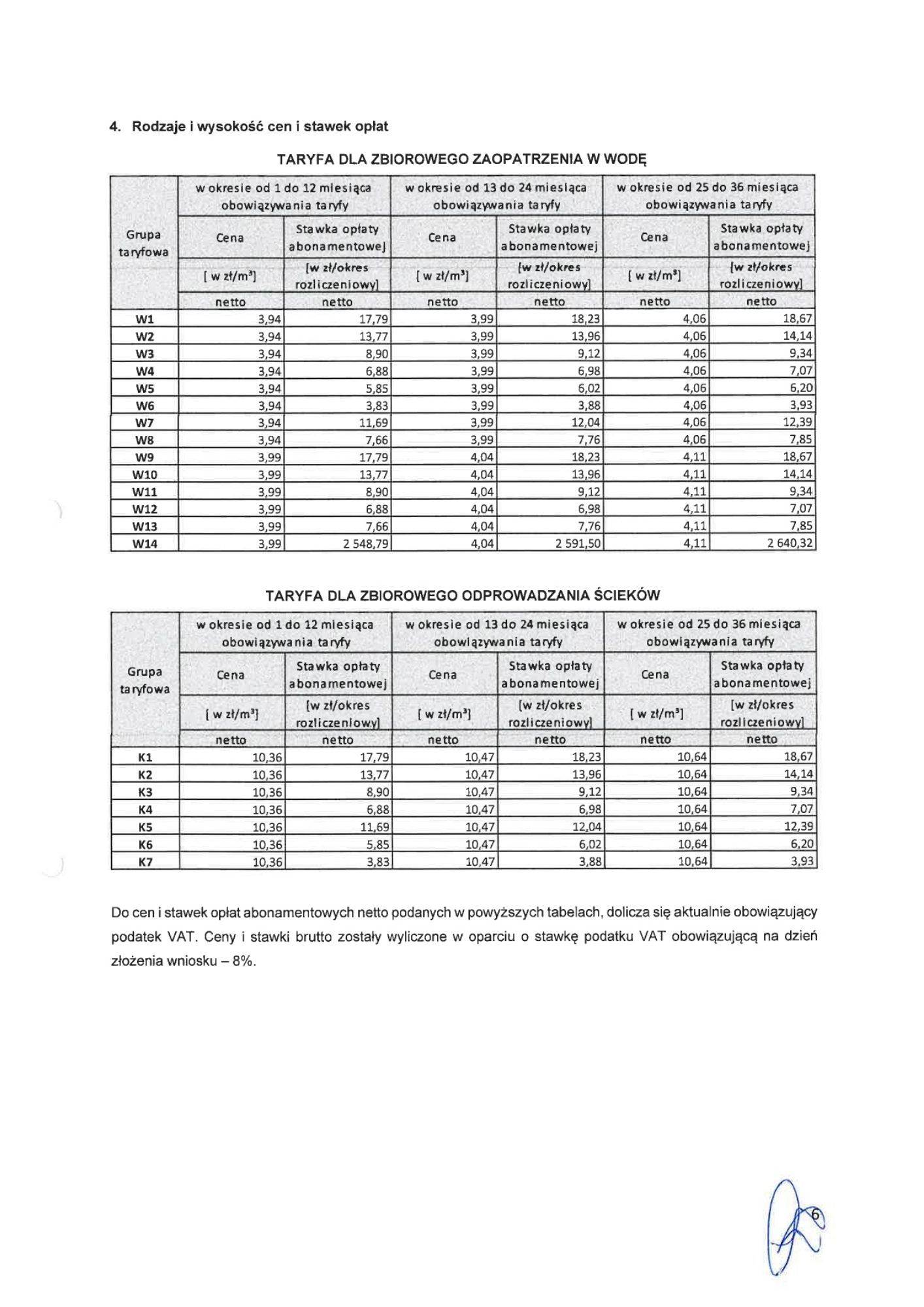 taryfy dla zbiorowego zaopatrzenia w wodę i zbiorowego odprowadzania ścieków na terenie